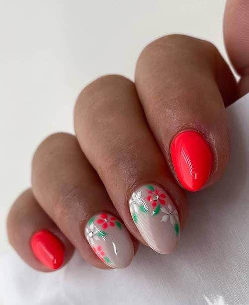 A glossy red polish is paired with nude accent nails decorated with small floral and gemstone details. The mix of bold color and subtle flower art creates a playful yet balanced summer look that feels fresh and feminine.