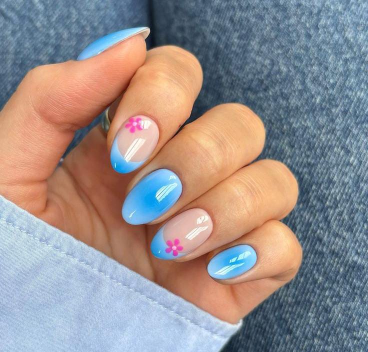 This design features a soft nude base with pastel blue ombre French tips for a breezy summer vibe. Tiny pink flower accents add a cute, youthful touch that feels light and effortless.