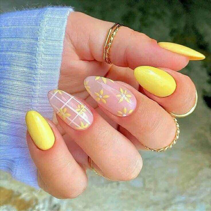 Bright yellow nails are mixed with sheer nude accents decorated with simple white grid lines and dainty daisies. The overall look is cheerful, light, and effortlessly summery.