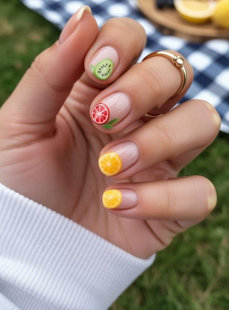 A neutral nude base is paired with tiny citrus fruit designs like lemon, orange, and kiwi for a playful summer touch. The style feels juicy, colorful, and fun without being too bold.