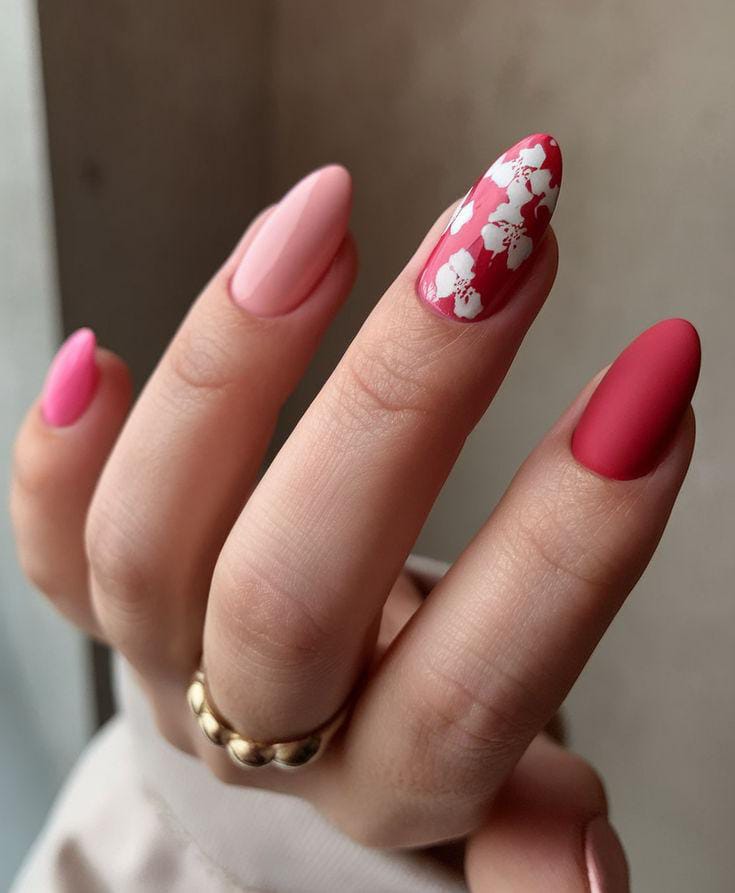 This design combines soft pinks and deeper rose tones with bold white floral art. The mix of glossy and matte finishes gives it a stylish yet easy summer feel.