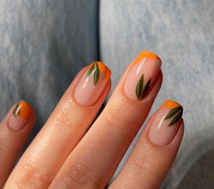 This design combines a clean nude base with bright orange French tips and simple green leaf details. It gives off a warm, tropical summer feel with a modern, minimal twist.