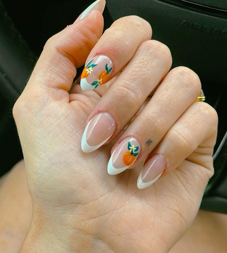This design mixes a classic white French tip with tiny orange fruit and leafy accents for a fresh summer feel. The soft nude base keeps it clean, minimal while the citrus art adds a playful, sunny vibe.