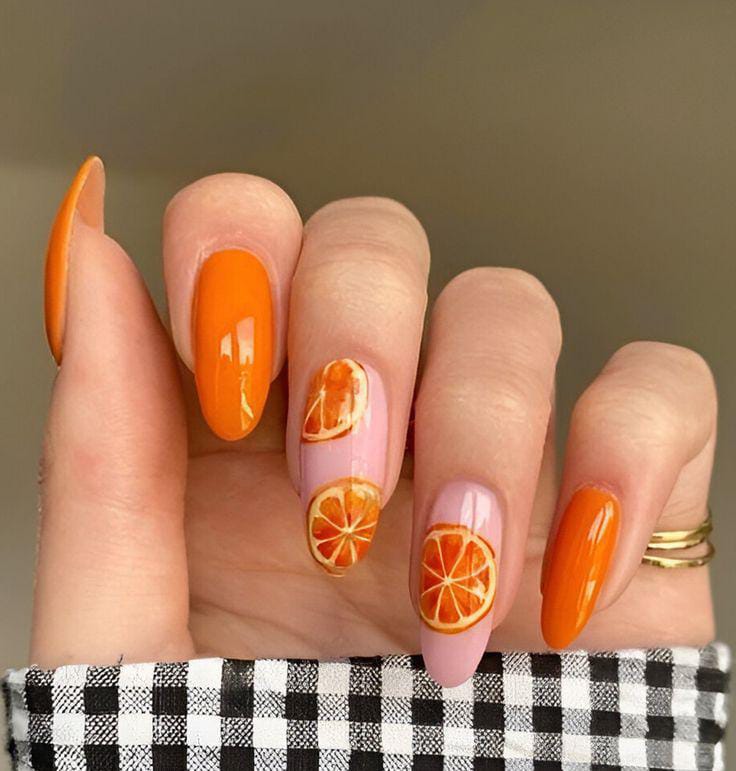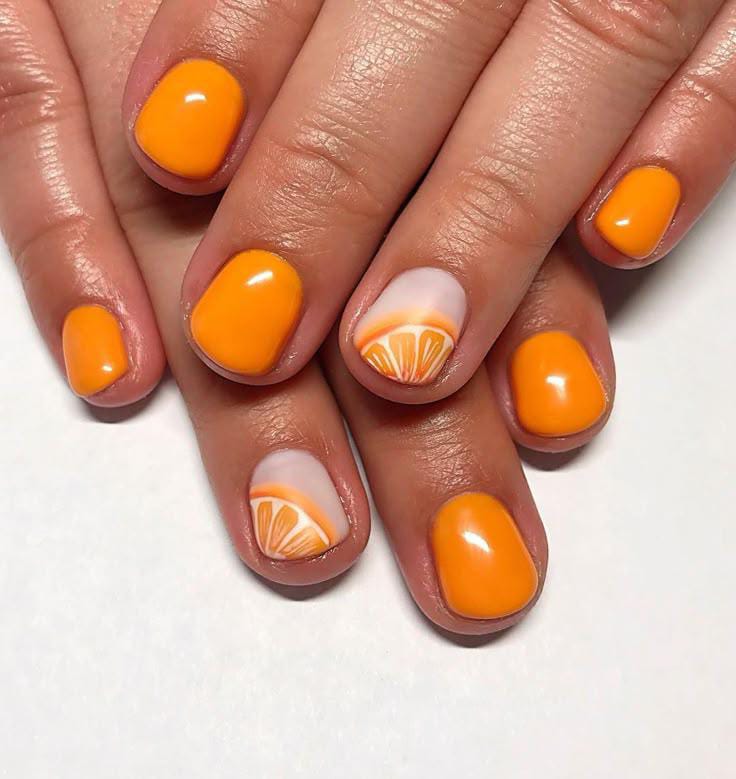 Bright orange polish is paired with glossy citrus slice nude nail art for a bold yet fun look. The mix of solid color and fruit details makes this design feel simple, energetic and perfect for summer days.