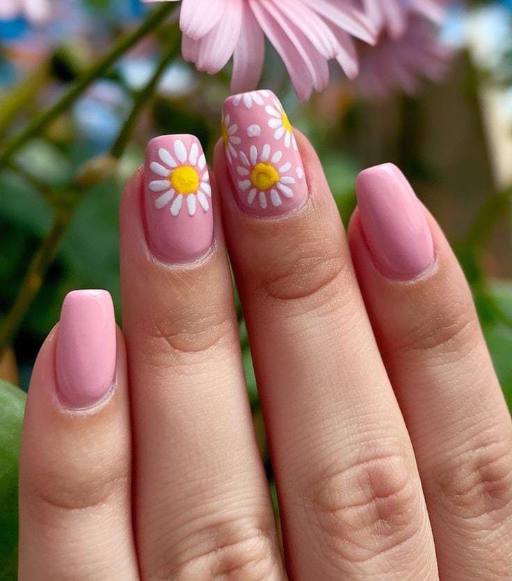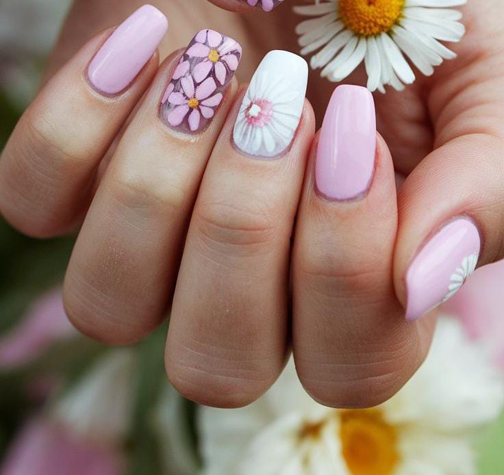 A mix of blush pink and white nails with delicate daisy florals creates a sweet, romantic look. The design feels airy, minimal and fresh, like a soft summer garden in bloom.
