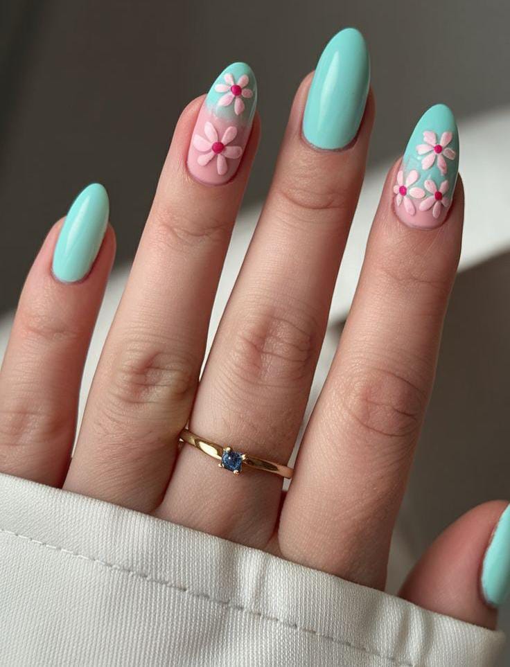 Mint green and blush pink ombre nails are decorated with subtle floral accents for a soft, modern feel. The pastel tones and gentle flower details give this design an easy, stylish summer vibe.