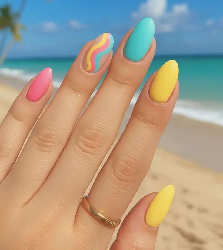 This design mixes pastel shades like yellow, blue, and pink with smooth, wavy accents. The vibe is relaxed and summery, giving off beach vacation energy with a soft, playful feel.