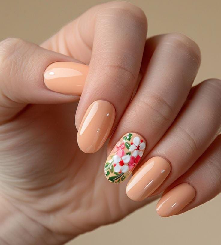 This design features soft peachy nails with a single floral and green leaf accent that adds a fresh, summery touch. The overall look is clean, glossy, and easy with a subtle pop of hand-painted flowers.
