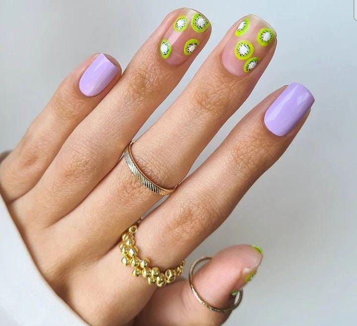 Light lavender nails are paired with tiny kiwi slice designs on nude nails for a fun, fruity summer vibe. It feels bright, youthful, and perfect for warm days when you want something cheerful but simple.