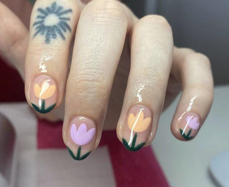 These nails use a clear or nude base with simple pastel tulip shapes near the tips. The style is minimal, artsy, and effortlessly cute — ideal for an understated summer manicure.