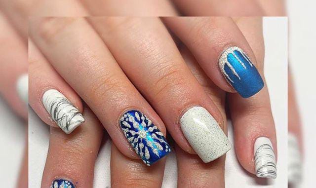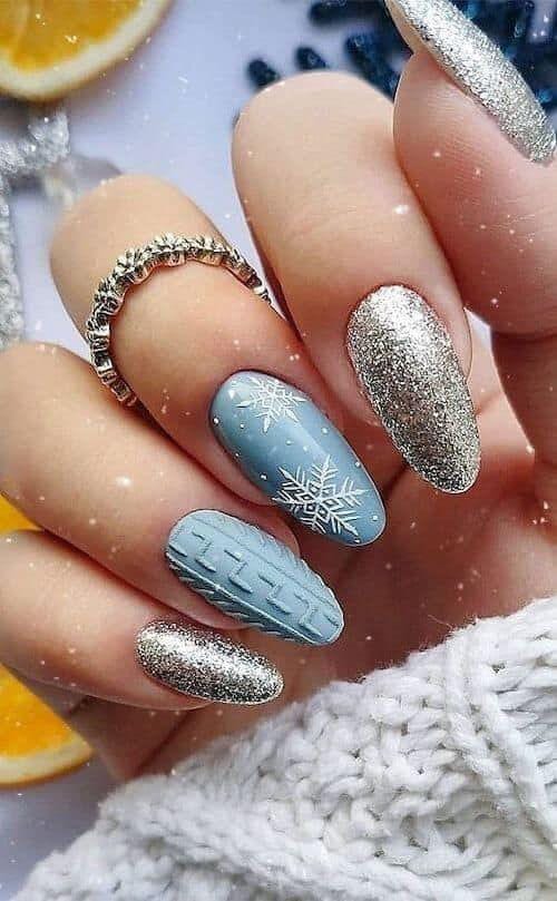 Mixing silver glitter with matte icy-blue nails, this set features snowflakes and a knitted texture accent for a cozy, sweater-weather feel. It’s a cute balance of glam and warmth, ideal for January-winter days.