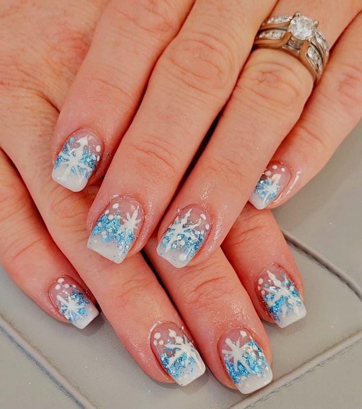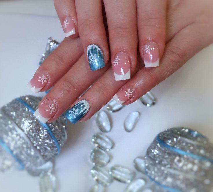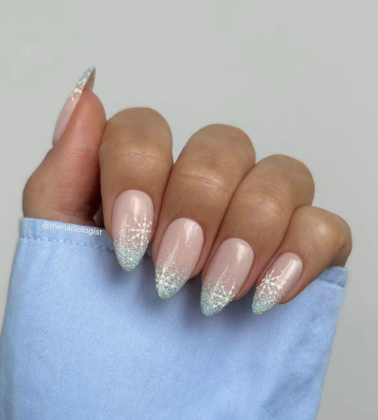 This design features soft nude nails topped with cool, icy-blue glitter tips and delicate white snowflakes, giving a clean and wintry vibe. It feels minimal yet festive, perfect for a cozy January look.