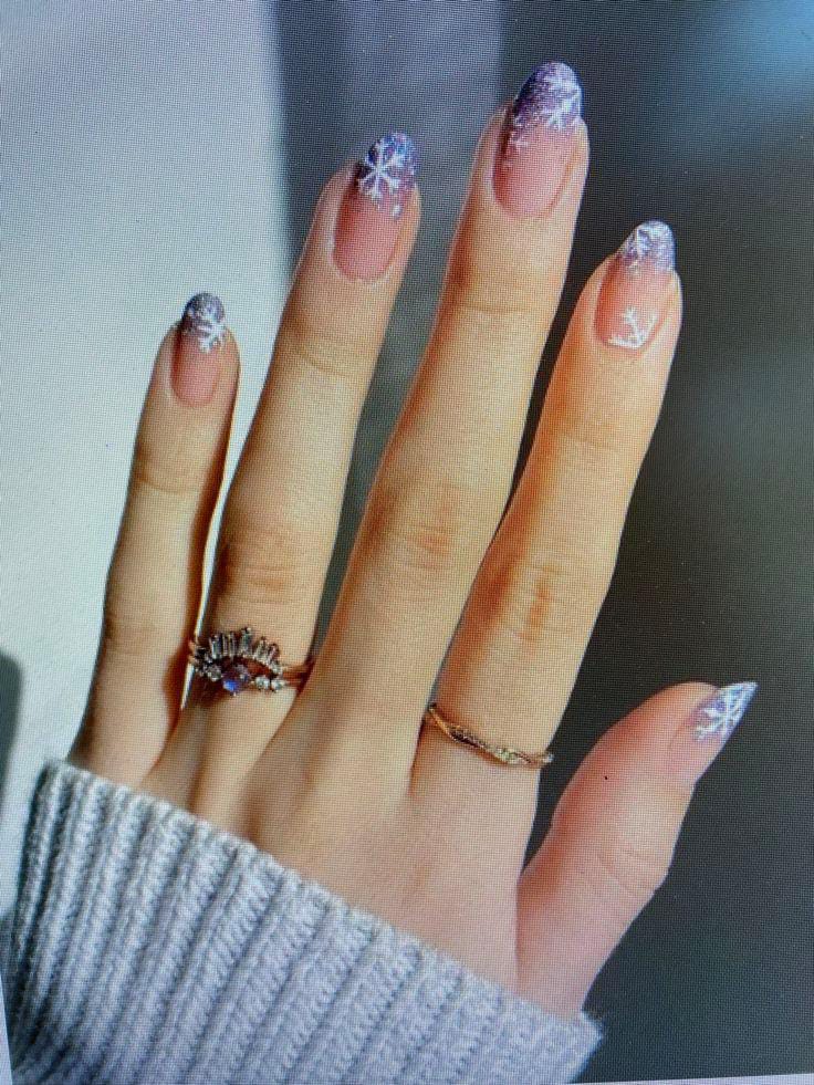 These nails combine a sheer pink shimmer base with deep navy French tips and small white snowflake accents for a stylish January contrast. The look is sleek, frosty, and just a little dramatic.