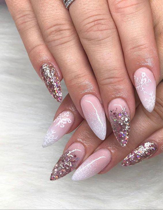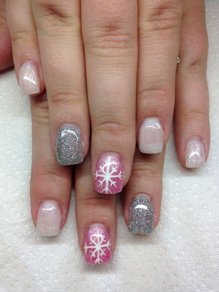 A soft pink base is paired with white snowflake details and chunky glitter, creating a mix of January elegance and festive sparkle. The glamorous touch while still feeling wintry and fresh.