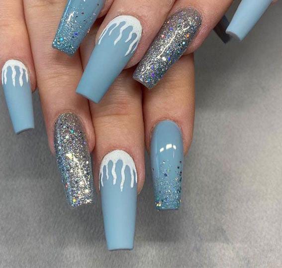 Featuring long, winter-blue nails paired with silver glitter accents and white “melting snow” drip art, this set has a stylish, modern cold-weather January feel. The mix of matte blue and full-glitter nails gives it a chic, frosty edge.