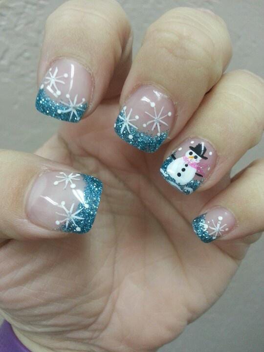 These short nails use glittery blue French tips and playful white snowflakes, with a cute little snowman for a fun winter twist. The look is charming and cheerful, perfect for a lighthearted January vibe.