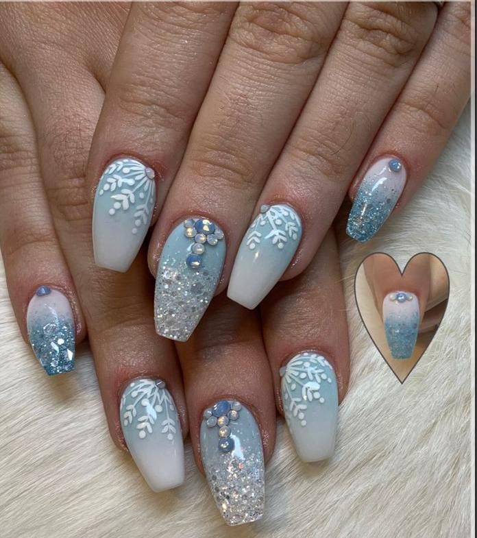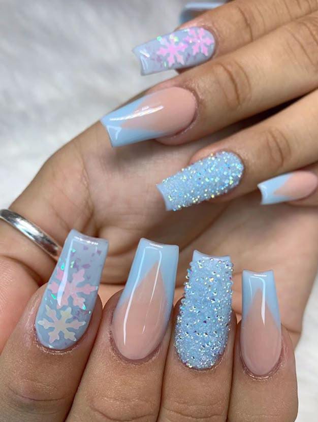 This look combines pastel blue tips, icy glitter textures, and translucent snowflake accents, creating a pretty and frosty January aesthetic. The mix of shimmering and smooth finishes makes it feel playful but polished.