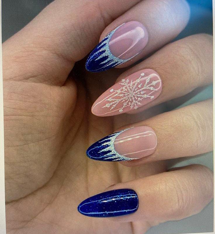These nails blend a soft nude base with deep blue tips that drip like glittery icicles, paired with a delicate snowflake accent. The look feels elegant, frosty, and very January winter-themed.