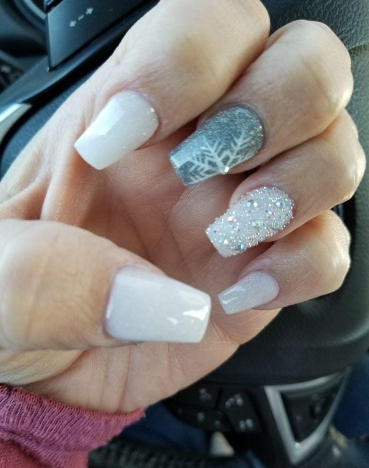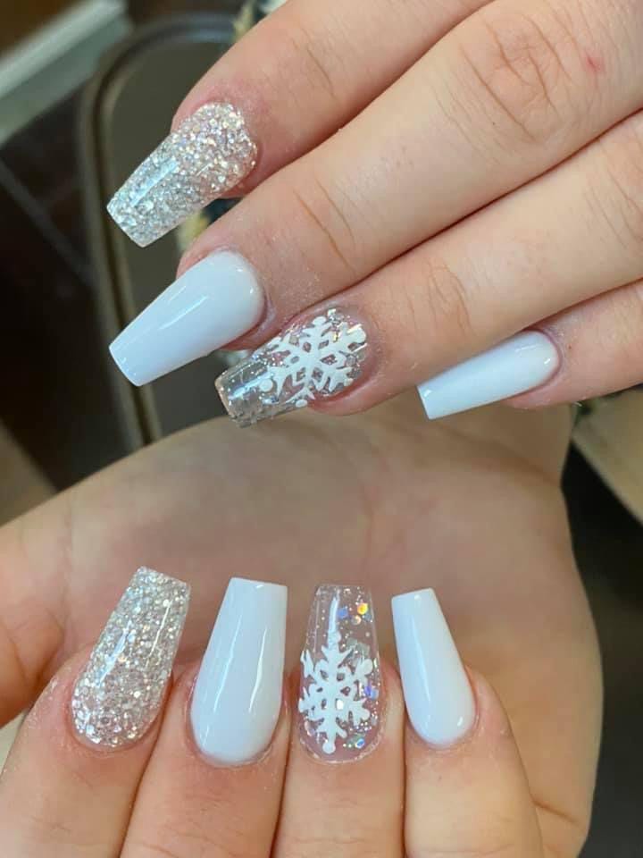 Bright white nails are paired with silver glitter accents and a clear nail featuring a bold snowflake, giving the set a clean but sparkly January feel. The combination of solid white and glitter makes it simple yet eye-catching.