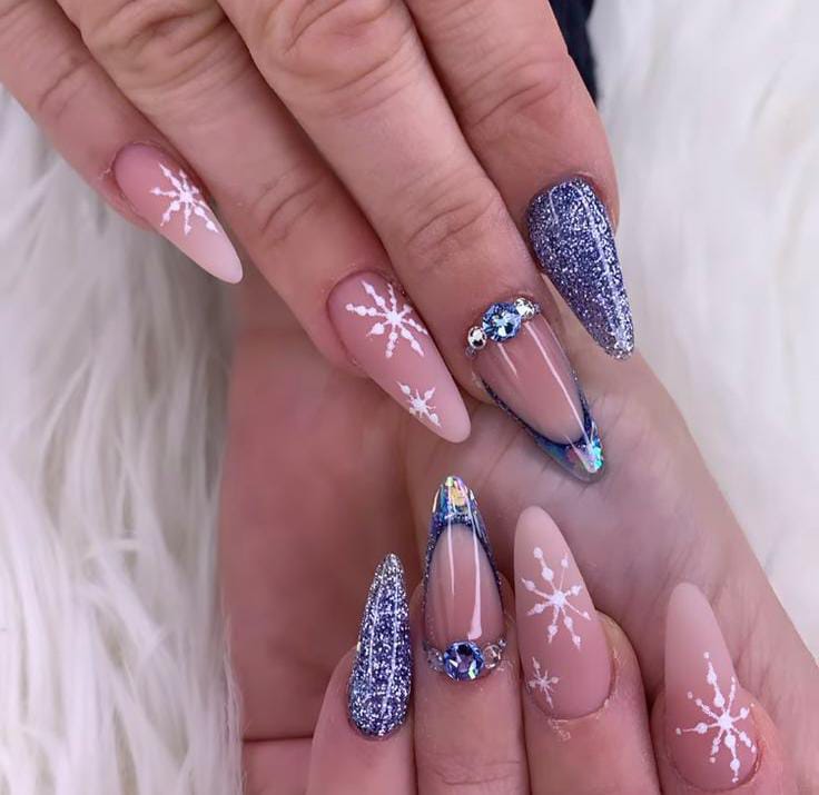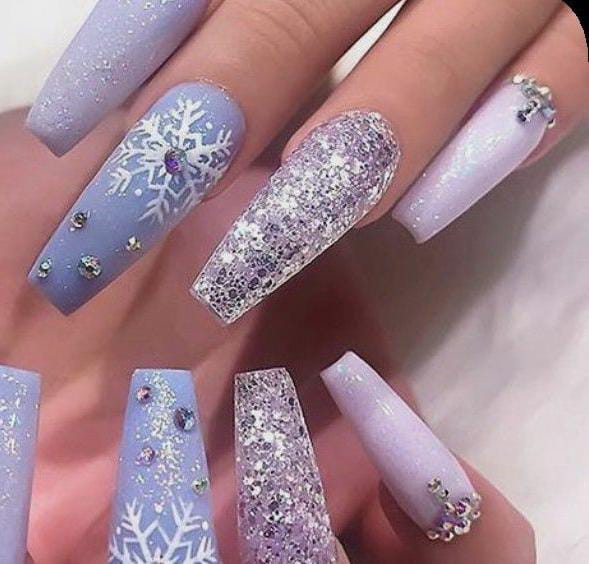 This design blends soft lavender tones with bold silver glitter and delicate snowflakes, giving the nails a frosty, glamorous winter look. The added rhinestones enhance the sparkly, ice-queen vibe perfect for January.