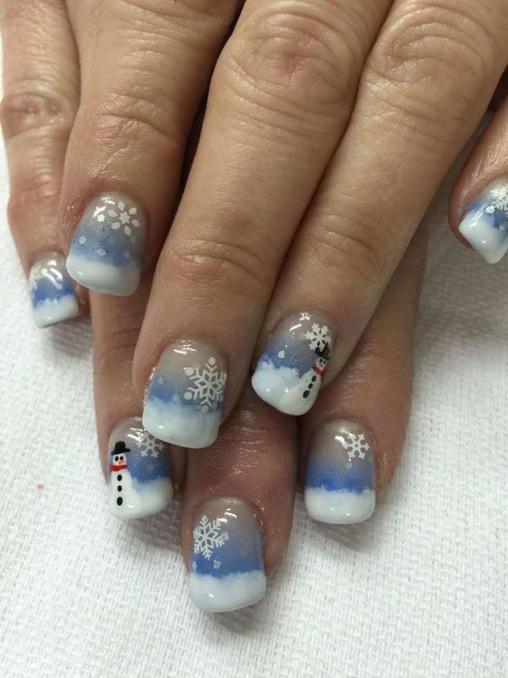 A soft gradient of blue and white creates a snowy background topped with small snowflakes and cute little snowmen, giving the nails a playful winter scene. The overall vibe is cozy, cute, and perfect for the January start of the year.