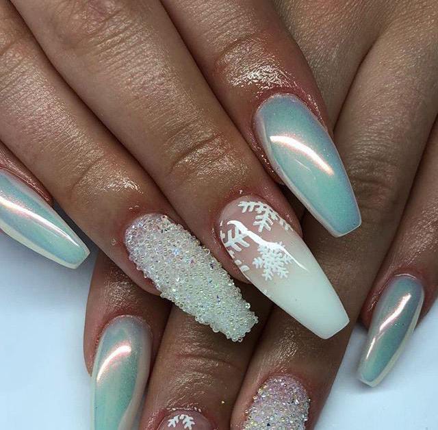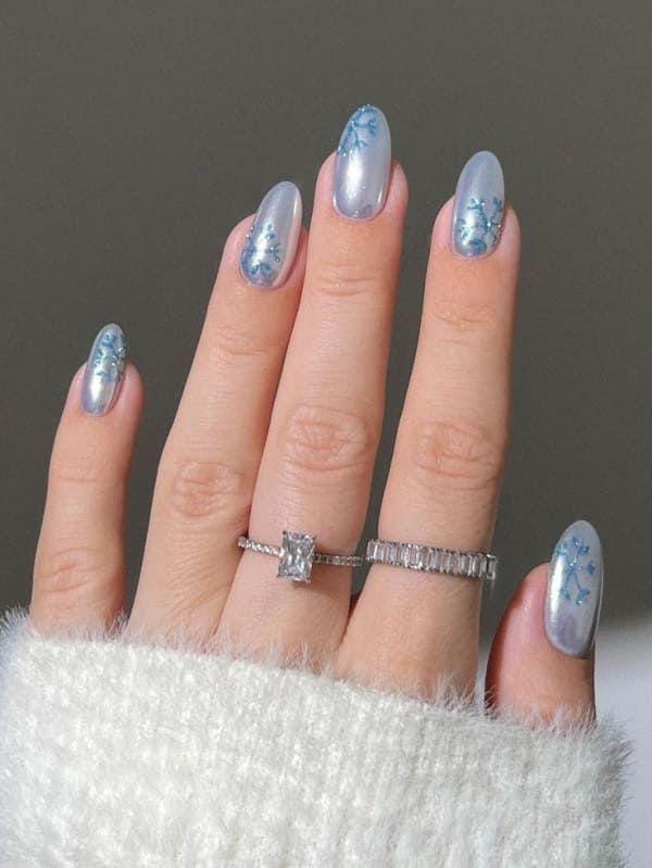 These sleek, pearly blue chrome nails are accented with small snowflakes, giving them a polished, frosty glow. The overall look is modern, cool-toned, and quietly glamorous for the January winter season.
