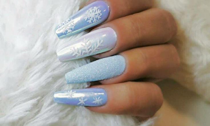 Long, frosty blue nails with shimmering finishes and white snowflake accents make this design look straight out of a winter wonderland. The mix of sparkle and cool tones gives it a magical January feel.