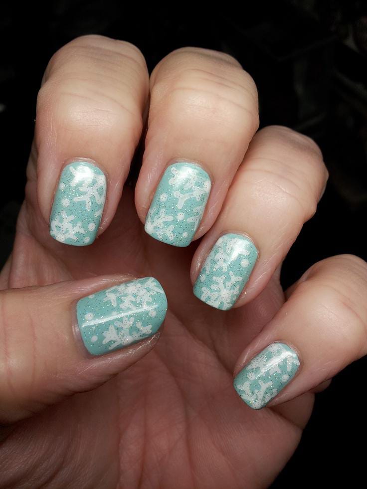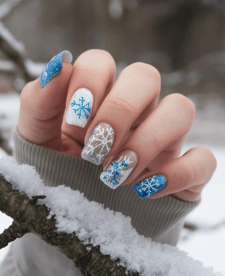 This bold set mixes bright blue and silver-white bases with scattered snowflakes, creating a crisp, snowy January look that stands out beautifully. The mix of glitter and winter motifs gives it a fun, frosty personality.