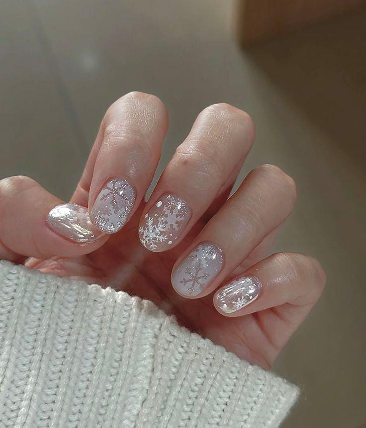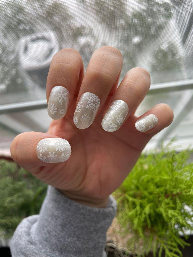 This design features a soft, milky base dusted with subtle shimmer and delicate white snowflakes, giving it a cozy winter look. It feels fresh, frosty, and perfect for the chilly start of January.