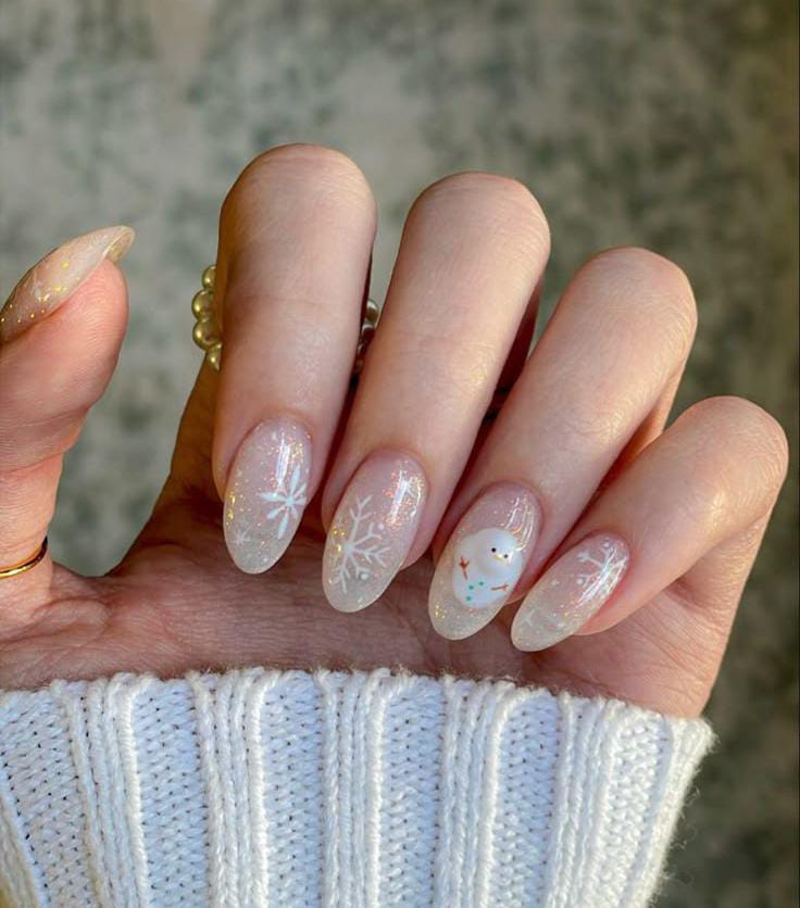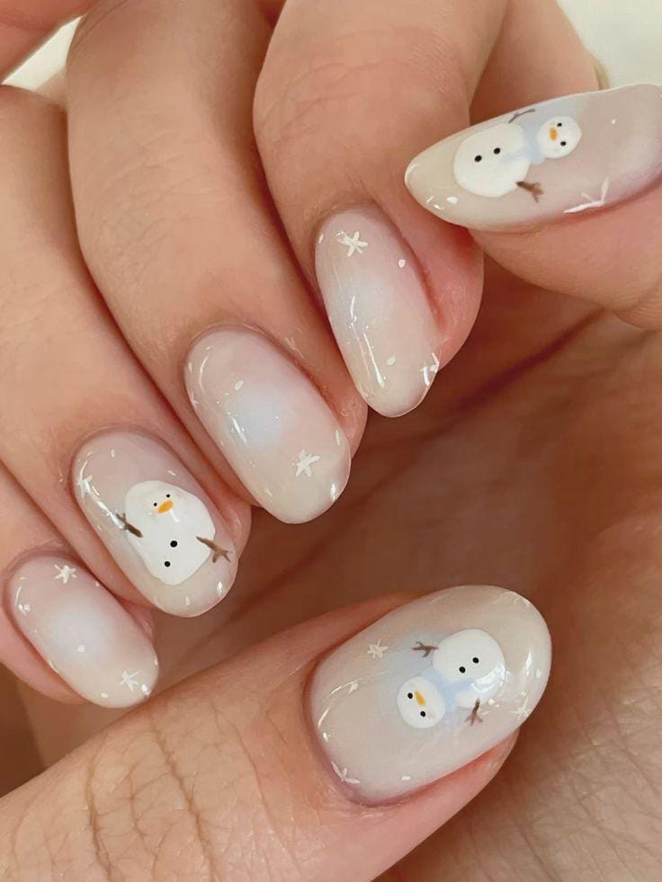 Soft gradient white nails decorated with tiny hand-painted snowmen create an adorable and playful winter vibe. The look is cute, light, and gives off a cheerful January feel.
