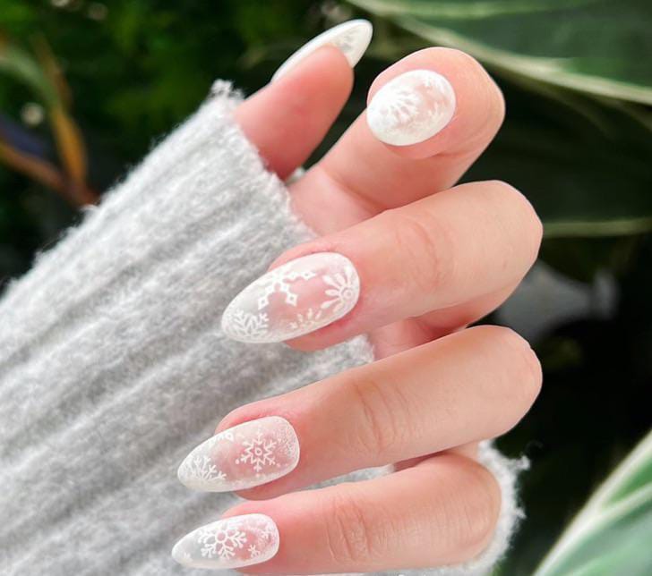 These almond-shaped nails use a frosty sheer base topped with intricate white snowflake patterns that look almost like lace. The overall style feels airy, elegant, and very winter January-wonderland inspired.