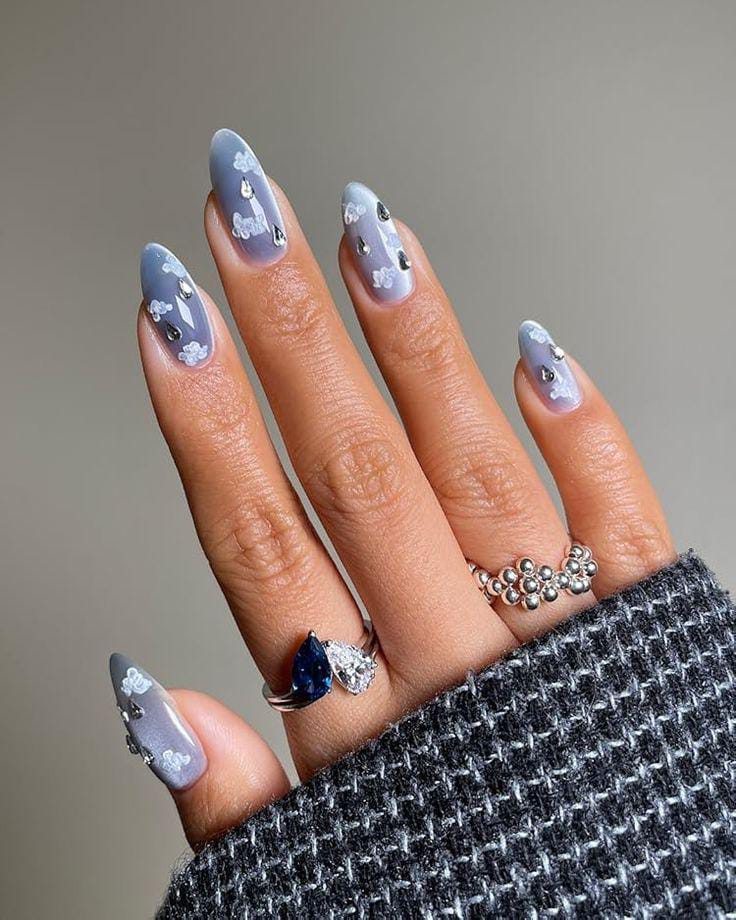 This design features soft blue-grey nails with tiny white cloud-like accents and silver raindrop-style embellishments. It has a moody, cozy “January weather” feel with a cute twist.