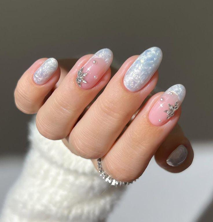 Featuring pearly white textured nails mixed with pink accent nails adorned with tiny gems and star shapes, this design blends icy elegance with a touch of January glam. It feels polished, stylish, and winter-princess inspired.