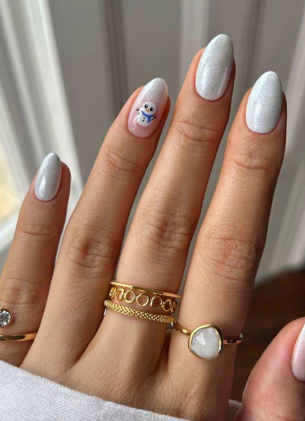 Fully glittered silver nails are paired with a cute snowman accent that adds personality and seasonal charm. The look is fun, festive, and full of January winter sparkle.