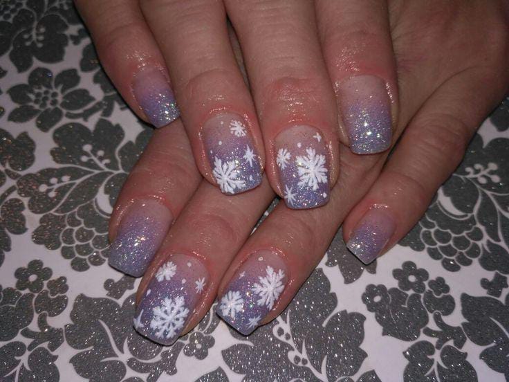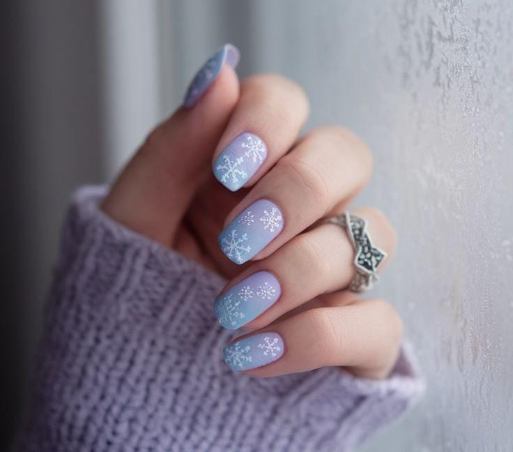Soft lavender-to-blue ombre nails decorated with tiny white snowflakes create a gentle, dreamy winter aesthetic. The design feels calm, cool, and perfect for the soft, cozy side of January.