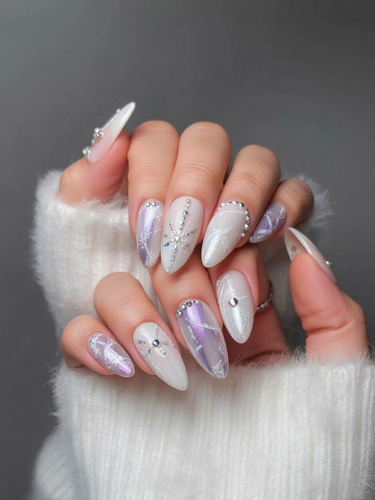 A dreamy mix of pastel shimmer—pink, blue, purple, and silver—paired with delicate snowflakes creates a magical, frosted-fairy look. The iridescent glow makes the nails feel light, airy, and January winter-wonderland inspired.