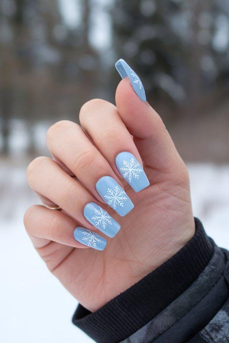 Soft blue nails paired with crisp white snowflake art create a simple, cute, and cozy January look that feels fresh and wintry.