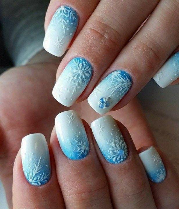 A smooth fade from bright winter white to cool blue, finished with frosty snowflake detailing, creates a refreshing and eye-catching winter January gradient.