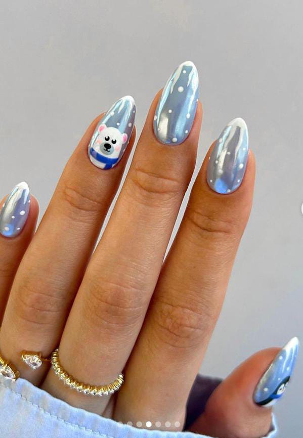 Shimmery blue nails with scattered white dots set a snowy backdrop, while a cute polar bear accent nail adds a fun, playful touch. It’s adorable, wintry, and perfect for anyone wanting a sweet January theme.