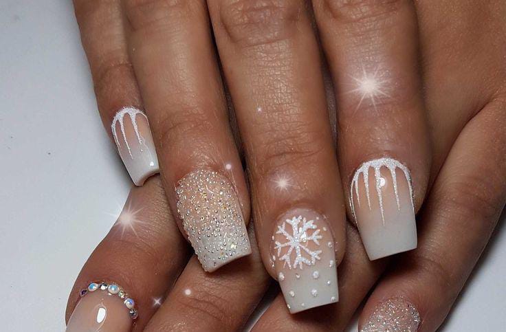 This set combines creamy nude-white tones with glittery textures, snowflake accents, and subtle drip designs for a chic yet festive January sparkle.