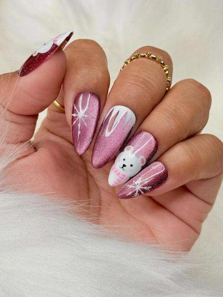 These nails blend shimmering pink tones with snowy textures, candy-cane stripes, and sparkly accents for a fun and festive winter January look. The mix of patterns keeps the whole design playful yet elegant.