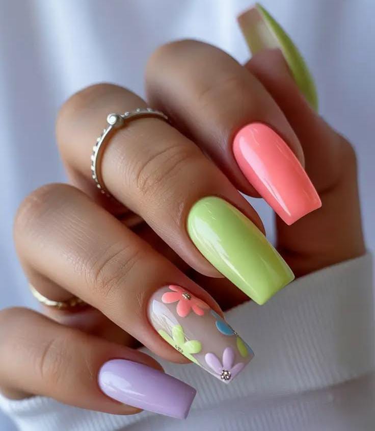 Bright coral, lime green, and soft lavender nails create a fun pastel mix with a clear accent nail covered in colorful daisy flowers. The design feels fresh, vibrant, and full of lively May energy.