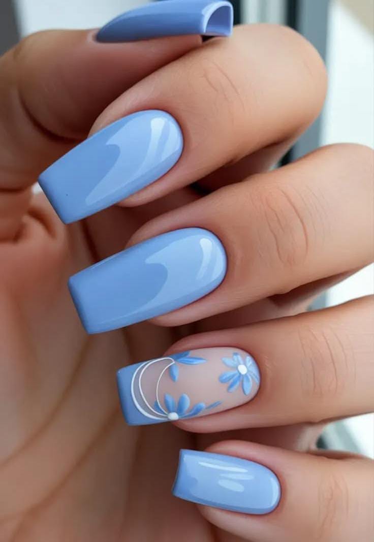 Glossy baby blue nails create a clean and vibrant look, with one accent nail featuring delicate blue daisy flowers over a soft milky base. The design feels fresh, bright, and perfect for a cheerful spring vibe and May manicure.