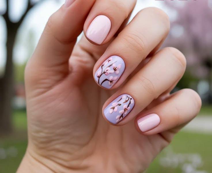 This manicure combines soft pink and light lavender shades with delicate blossom branch artwork on the accent nails. The overall style looks gentle, elegant, and perfectly captures the calm beauty of spring perfect for May.