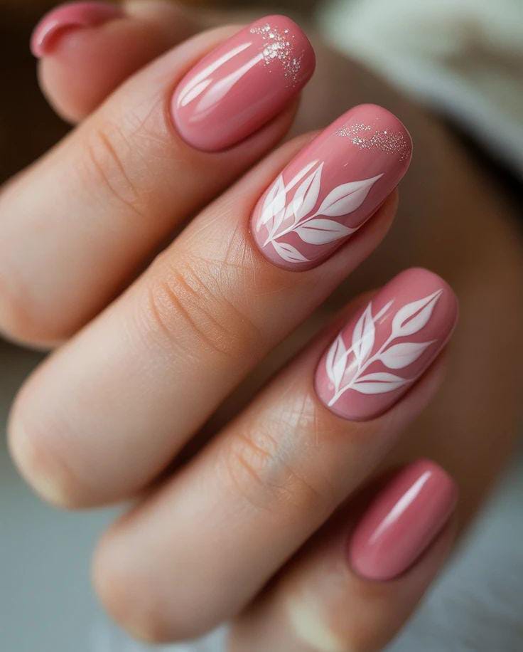 Soft dusty pink May nails create a classy and feminine base, highlighted with delicate white leaf designs on the accent nails. A touch of subtle glitter near the tips adds a light sparkle that feels elegant and fresh for spring.