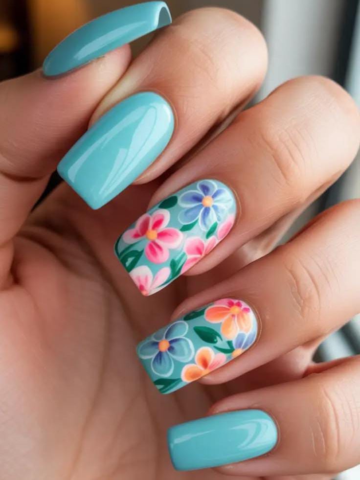 Bright turquoise nails are paired with colorful floral accent nails filled with playful pink, blue, and orange flowers. The design feels lively, cheerful, and perfect for a fun May or summer-inspired manicure.