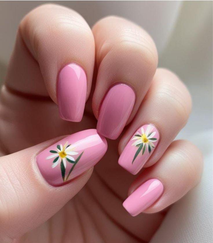 Glossy soft pink nails keep the look simple and feminine, with a couple of accent nails featuring small white daisy flowers. The design feels sweet, clean, and perfect for a light May manicure. 🌼