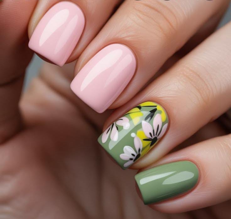This design pairs glossy blush pink nails with a muted green accent for a fresh spring look. A delicate white floral pattern with hints of yellow adds a soft, nature-inspired vibe perfect for May.