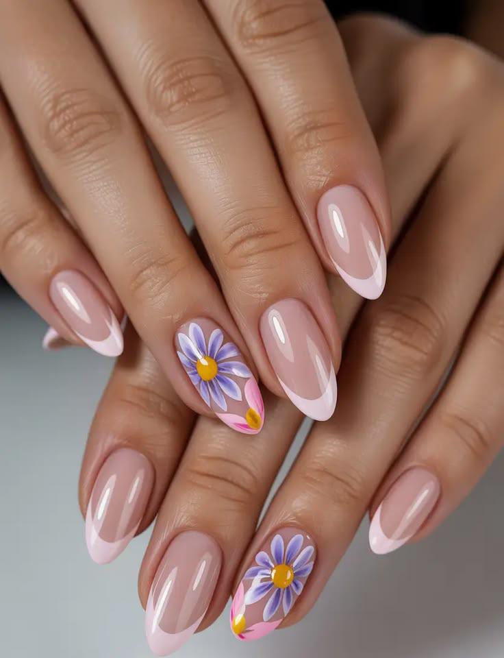 A sheer nude base with soft blush French tips creates a clean and elegant style. The accent nails feature soft purple daisies with yellow centers, giving the manicure a cheerful May summer garden feel.