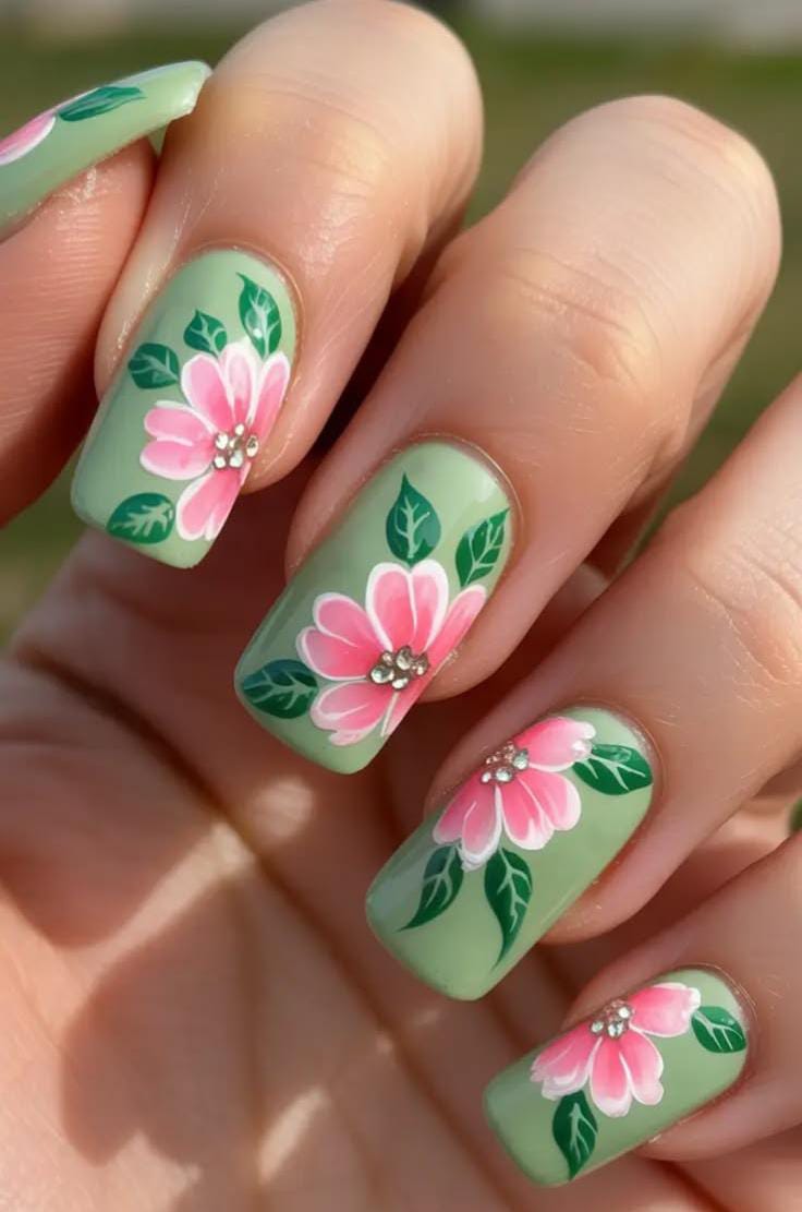 A soft sage green base is decorated with hand-painted pink flowers, center gemstone and leafy details for a fresh spring-inspired look. The glossy finish and delicate floral art give the nails a bright and cheerful May vibe.